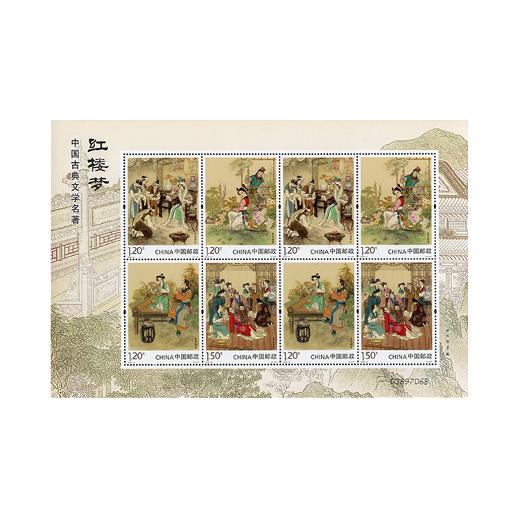《红楼梦》,原名《石头记》,章回体小说。作品以贾、史、王、薛四大家族为背景,以贾宝玉、林黛玉的爱情悲剧为主要线索,描写了贾家荣、宁二府由盛转衰的过程。全书内容广泛,涉及各个学科,如诗词歌赋、琴棋书画、建筑亭阁、舟车行轿、服饰妆容、婚丧祭祀、饮食药膳、茶酒文化以及佛教、道教、儒家思想等传统文化,几乎无所不包。全书语言优美生动,善于刻画人物,塑造了许多富有典型性格的艺术形象,具有卓越的艺术成就。第二组四枚邮票分别表现了第十四、三十、三十一、三十三回中的场景,小型张表现了小说第十八回中的场景。