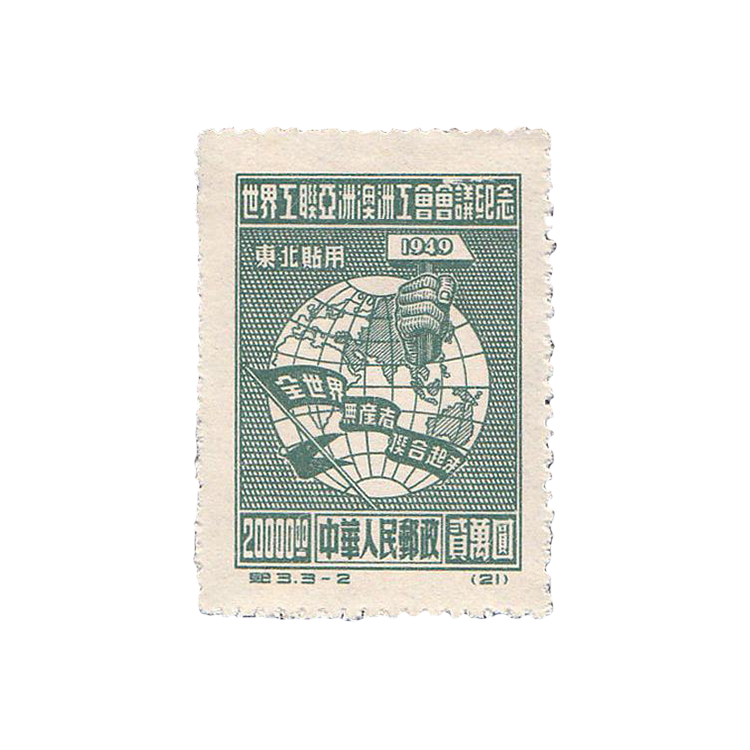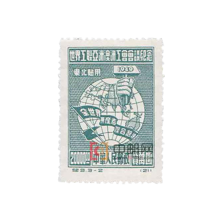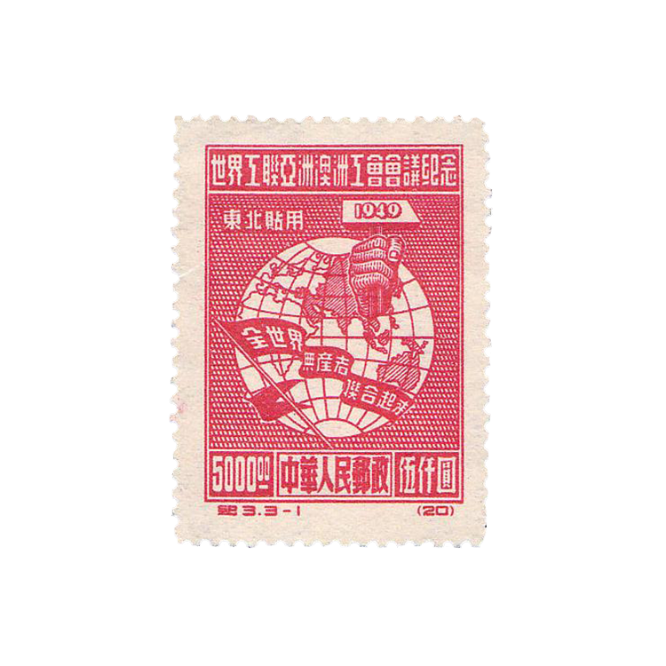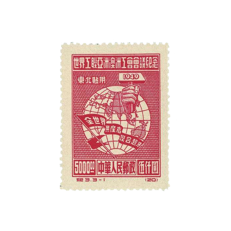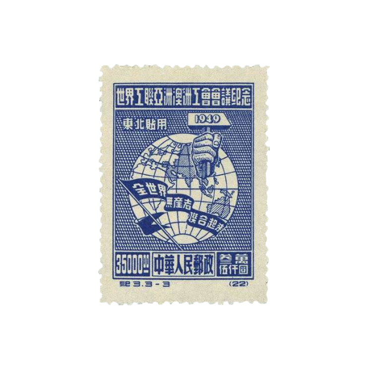 1949年11月16日,为祝贺这次会议在刚刚诞生的新中国召开,华北邮政总局发行了《世界工联亚洲澳洲工会会议纪念》东北贴用纪念邮票,全套3枚。为适应集邮事业的发展需要,邮电部1955年1月10日发行再版票。邮票图案相同,均为宇宙间一颗硕大的地球,上绘亚洲、澳洲的版图,其中一只紧握上书“1949”字样铁锤的大手,从中国首都北京的位置上伸出,象征着工人阶级为改善生活和劳动条件而奋斗。下部分为一面写着“全世界无产者联合起来”的旗帜形彩带。