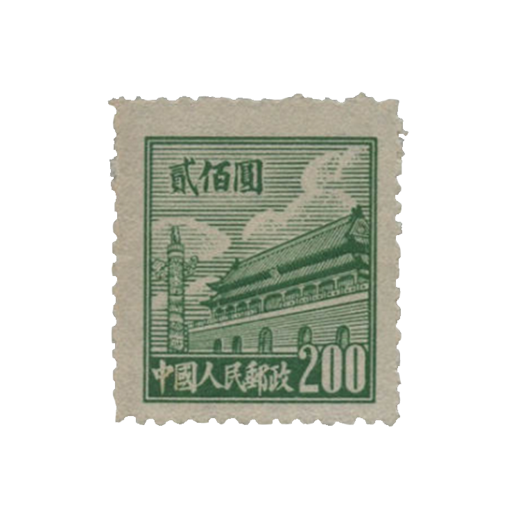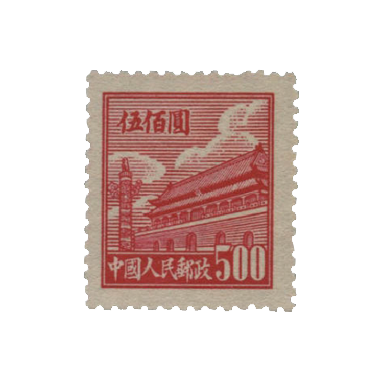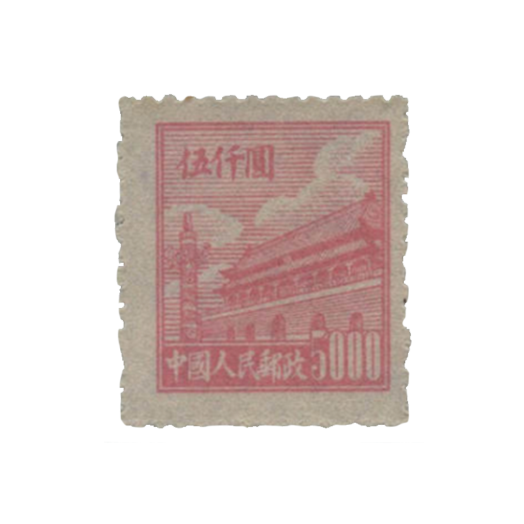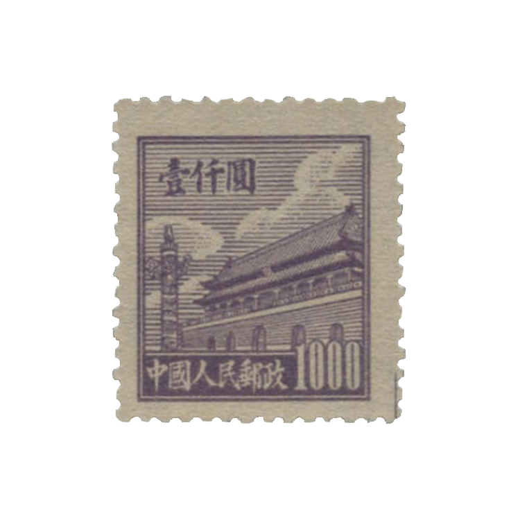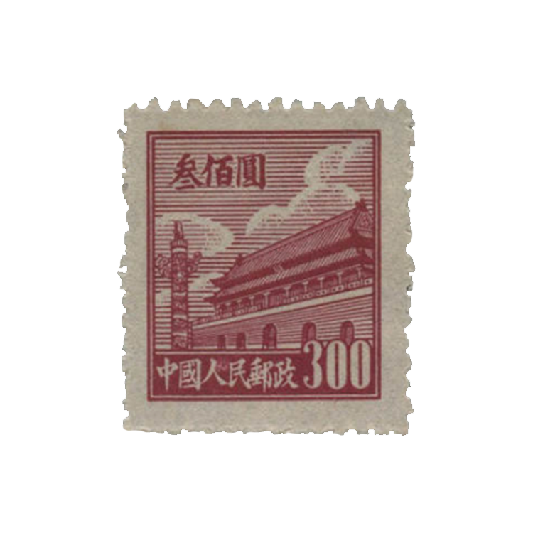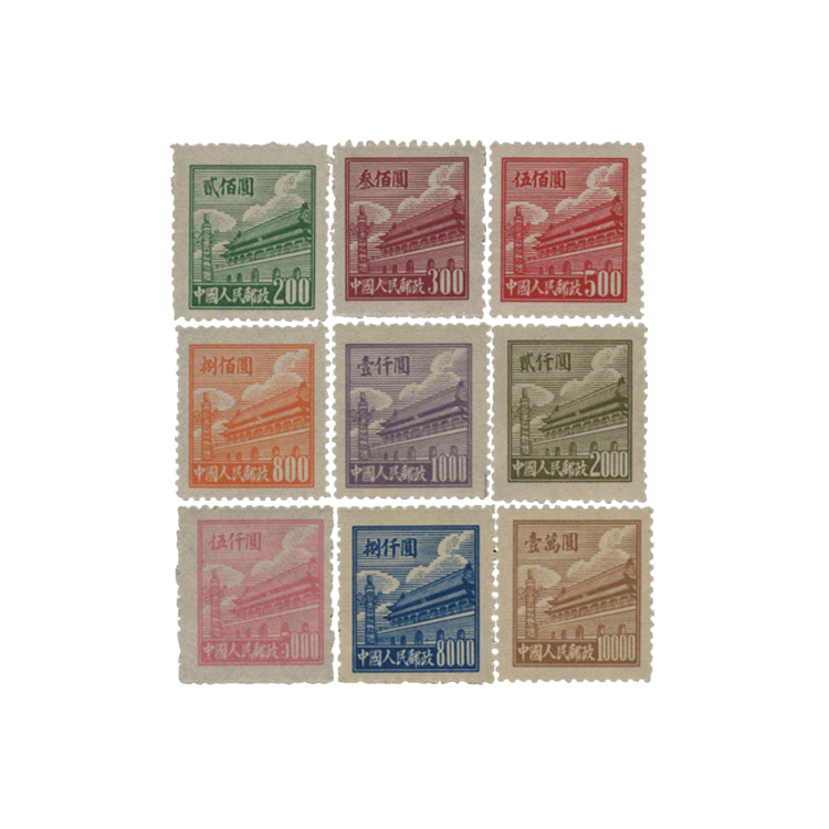 1950年1月1日,邮电部邮政总局成立,除东北地区外,全国不仅统一国内邮资,而且有了全国统一的邮政机构。1950年1月9日,邮政总局颁发国际邮件资费表。1月14日邮政总局发出通令,规定邮票由邮政总局统一印发,过去各解放区自印的各种邮票一律停止印刷,以印成或加字改值的邮票,售至同年3月底,已售出的邮票用至5月底为止。为适应邮政业务的发展需要,中国人民邮政发行了第一套普通邮票,编号普1,全套9枚。邮票采用胶版印刷,胶版的特点是图案花纹和空白部分相平,图案上边两条边线下的第一条横线与右边边框不连接,华表石中部的右边五条横线与柱身相连,图案左右两边的内边框线是由上至下与下框相连。天安门上空白云为三朵,天安门城墙上没有悬挂毛泽东画像。