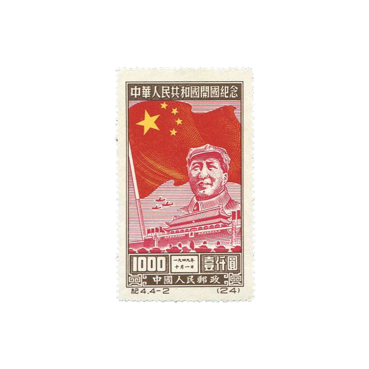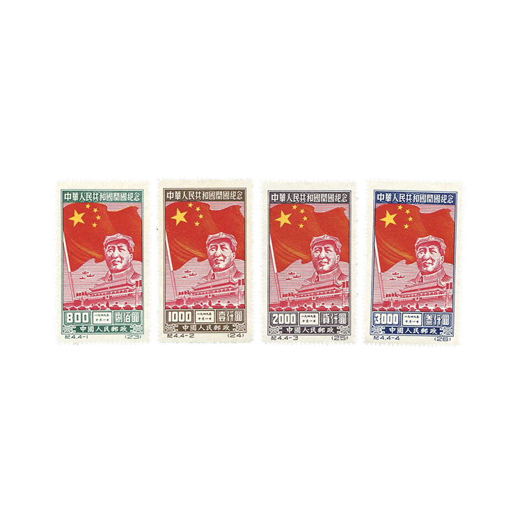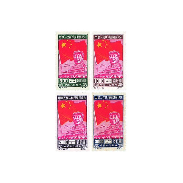 1949年10月1日15时,在天安门广场举行开国大典,庆祝中华人民共和国中央人民政府成立。为纪念这一历史事件,自1949年北平解放之后,便积极着手筹备人民政协第一届全体会议和中华人民共和国成立两套纪念邮票的发行工作。但因后来对图稿多次修改,如票型由横版改为竖版;“中华人民邮政”改为“中国人民邮政”;由于邮资的调整,使这套邮票从选题、设计、印制直到发行,将近1年,迟至1950年建党纪念日才问世。全套4枚邮票,图案相同。庄严的五星红旗第一次在中国邮票上出现。毛泽东主席,宏伟的天安门以及接受检阅的人民解放军的坦克、飞机,都形象地记录了新中国开国盛典的这一伟大的历史时刻。亦发行了东北贴用套票,并于1955年1月10日再版。这套邮票被评为建国30年最佳邮票之一。