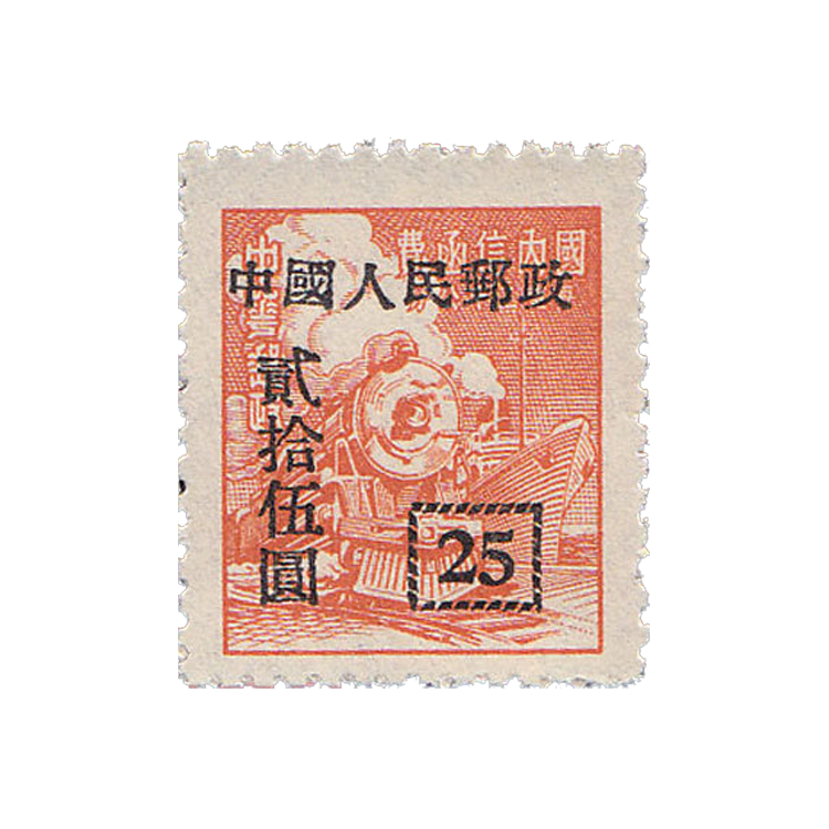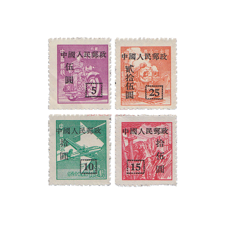 1950年5月发行的“改1”以中华邮政时期无面值的单位邮票为原票,加字改值,共有6种面值。原票虽然只有4种图样,但曾由上海大东书局和香港亚洲石印局两家印刷,前者为圆孔齿,后者为虚线齿,其中“快递挂号”改100元一种,以亚洲版票加盖的,未经大量出售,这套邮票已宣告停用了。