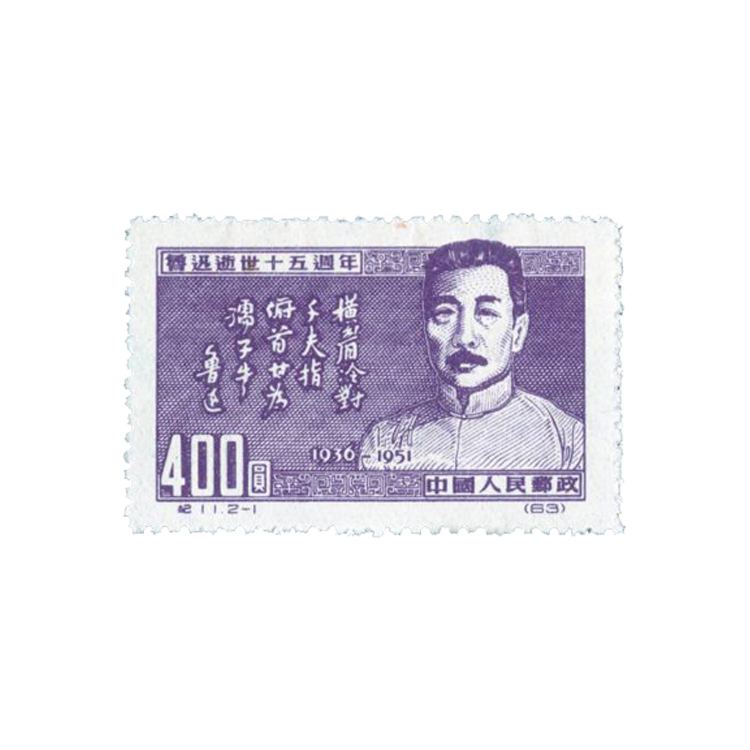 1936年10月19日,鲁迅因肺病,在上海与世长辞,享年56岁。巨星陨落一十五载。为了纪念他,邮电部发行了这套《鲁迅逝世十五周年》纪念邮票。全套2枚,画面相同,均为鲁迅半身画像及诗句:“横眉冷对千夫指,俯首甘为孺子牛。”这两句话,源自1932年10月12日鲁迅写给著名爱国人士柳亚子先生的一首小诗,题为《自嘲》,全文:“运交华盖欲何求,未敢翻身已碰头。破帽遮颜过闹市,漏船载酒泛中流。横眉冷对千夫指,俯首甘为孺子牛。躲进小楼成一统,管他冬夏与春秋。”这首诗写在中国最为黑暗的年代,面对外部日本帝国主义的疯狂侵略和内部国民党反动派残酷压迫及文化“围剿”,鲁迅以幽然的笔调和自嘲的口吻,描述了自己深受迫害的险恶处境,抒发了顽强的斗志和乐观的豪情。这套邮票于1955年1月10日再版。