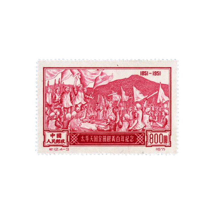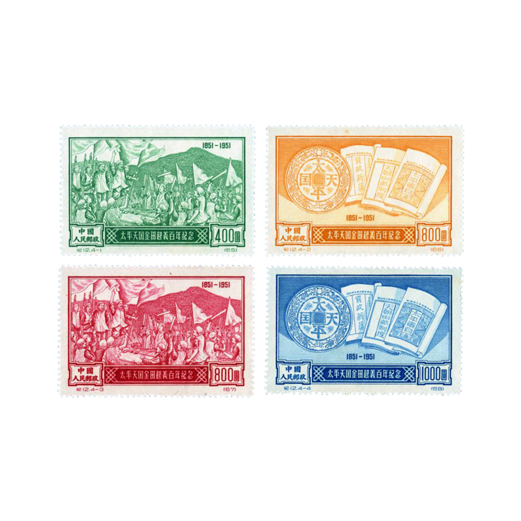 本套邮票共4枚。(4-1)(4-3)画面为“金田起义”,主图是挥动旗帜,手执长矛、大刀的起义农民,背景是紫荆山。右上角是“1851-1951”字样,下端是“太平天国金田起义百年纪念”和“中国人民邮政”字样及面值。画面真实地反映了金田起义的情景。邮票刷色分别为草绿和红色。(4-2)(4-4)画面为“太平天国文献和钱币”,主图为《天朝田亩制度》《资政新编》《太平军目》等太平天国文献和太平天国钱币“圣宝”。邮票刷色分别为桔黄和蓝色。