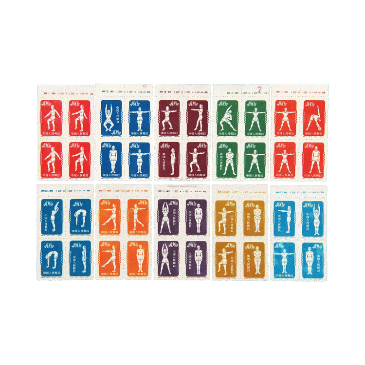 这套邮票的原版发行于1952年6月20日,再版发行于1955年1月10日,两个版本的主要区别就是再版的纸要比原版的纸厚而且白,邮票上的图案分别展现出了广播体操的不同体型姿势。