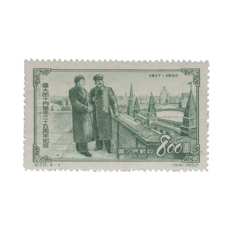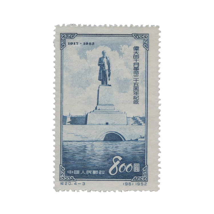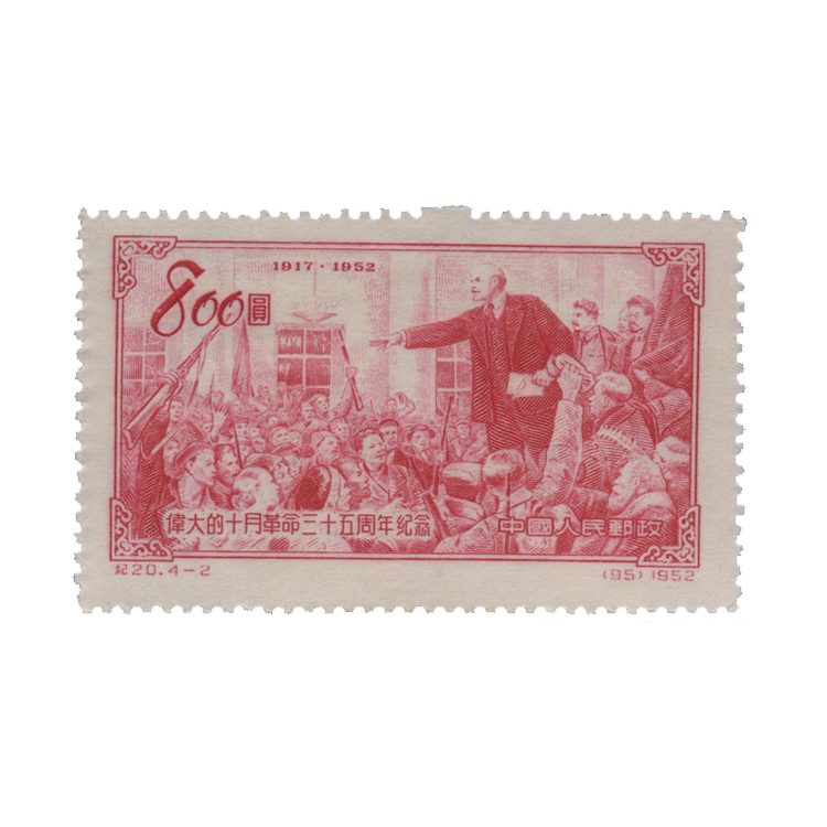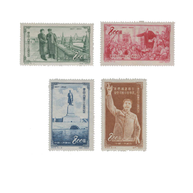 1953年10月5日邮电部为纪念苏联十月革命三十五周年发行的邮票,1套4枚。