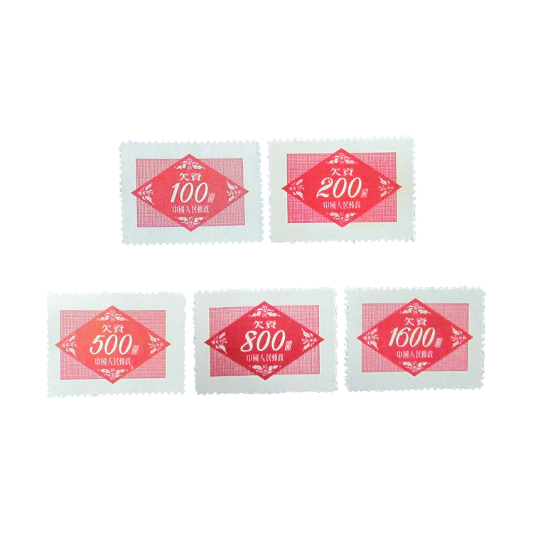 全套5种,画面均呈红色,主图相同,票幅为横长方形,内置菱形框,欠资面值居中,字体较大,突出醒目;“欠资”和“中国人民邮政”分列面值上下。这套票使用到1955年12月,从发行到停用仅一年多。1955年3月,币制变更,它便逐渐进入集邮领域,新票相对较多。