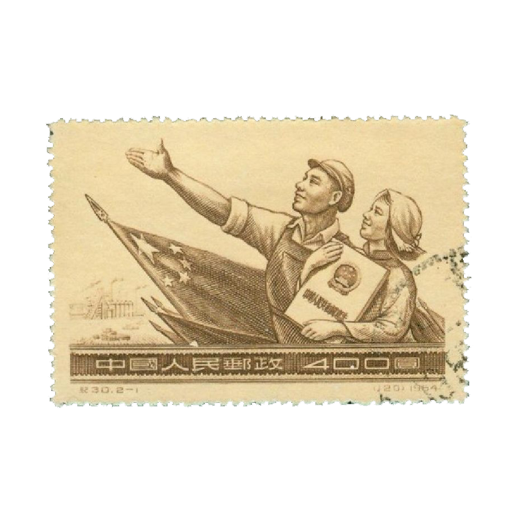 我国邮电部发行“中华人民共和国宪法”纪念邮票,编号纪30,全套2枚,图案相同,均为工人、农民怀抱《中华人民共和国宪法》,在红旗漫无边际卷中,展望社会主义建设的灿烂前景的场面。表现了全国人民在宪法的指引下,乘胜前进的姿态和信心。
