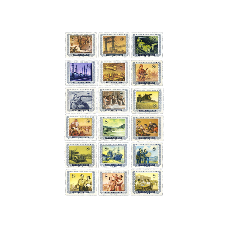 邮电部为了宣传第一个五年建设计划的美好图景和伟大意义于1955年10月1日发行,1套18枚。