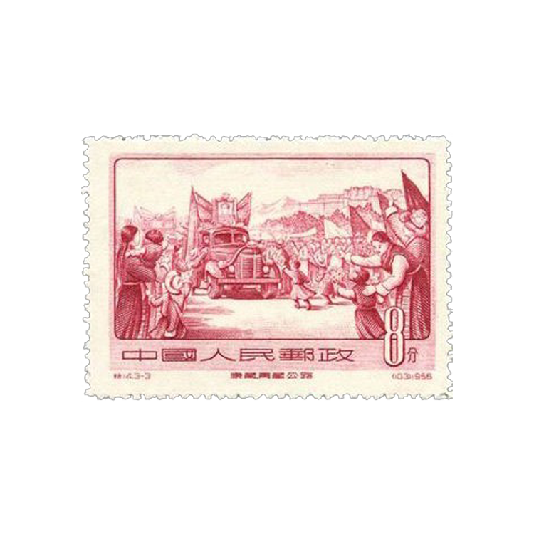 1956年3月30日,为了反映西藏公路建设的新面貌,中华人民共和国邮电部发行一套《康藏、青藏公路》特种邮票,全套3枚。卢天骄设计。雕刻版。宋广增、高振宇、孔绍惠雕刻。齿孔14度。无背胶。邮局全张枚数(1)(3)为80(8×10),(2)为91(13×7)。北京人民印刷厂印制。