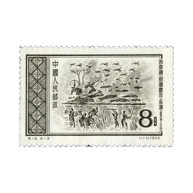 1956年10月1日,为了反映中华民族悠久灿烂的文化艺术,中华人民共和国邮电部发行一套《东汉画像砖》特种邮票,全套4枚。孙传哲设计。雕刻版。孔绍惠雕刻。齿孔14度。邮局全张枚数96(8×12)。北京人民印刷厂营业分厂印制。