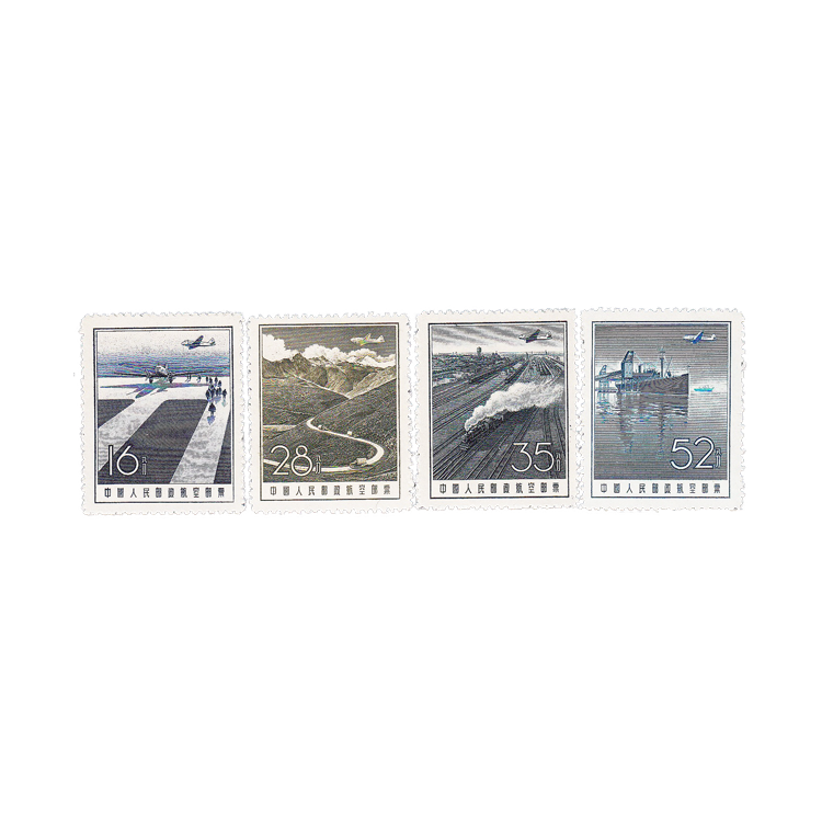 新中国交通运输事业有了巨大的发展,中国人民邮政于1957年9月20日发行了第二套航空邮票。本套航空邮票选择飞机、汽车、火车、轮船作为图案题材。作为航空邮票标志,各枚邮票的右上角均有飞机在天空中飞翔。