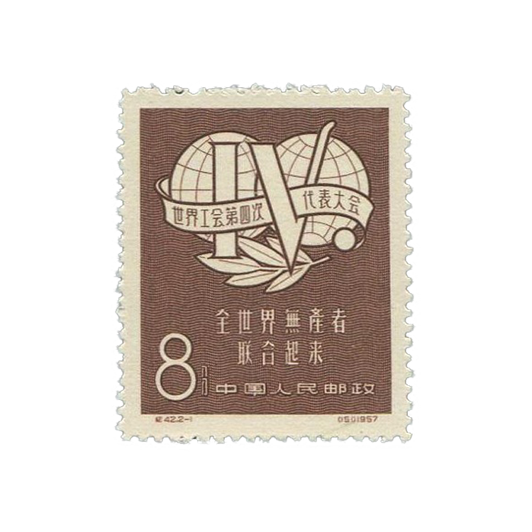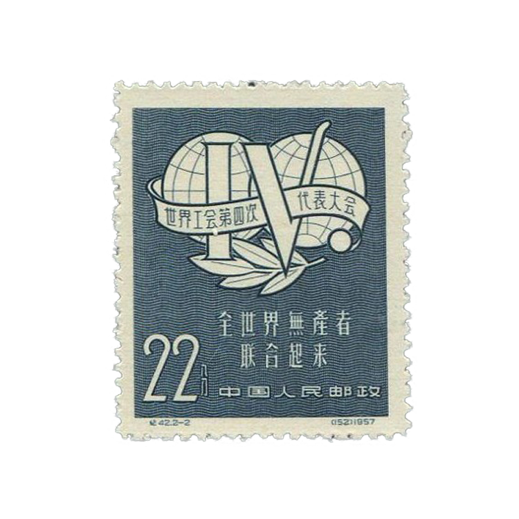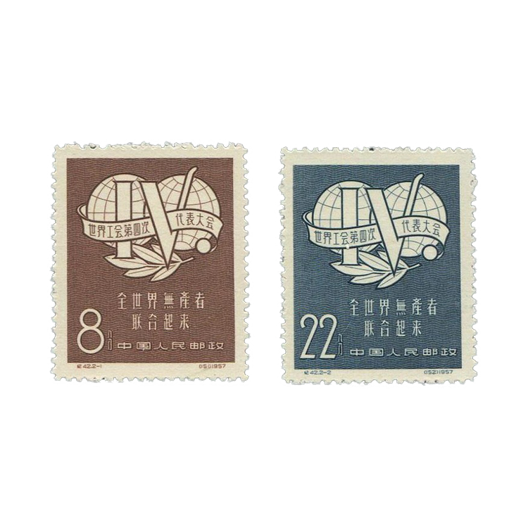 邮电部为了庆祝世界工会联合会的召开,在会议开幕前夕,1957年9月30日发行了《世界公会第四次代表大会》邮票。1套2枚。