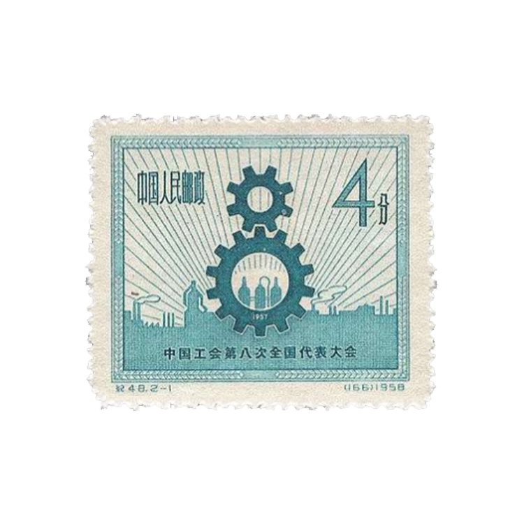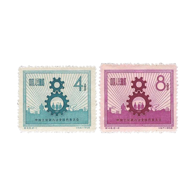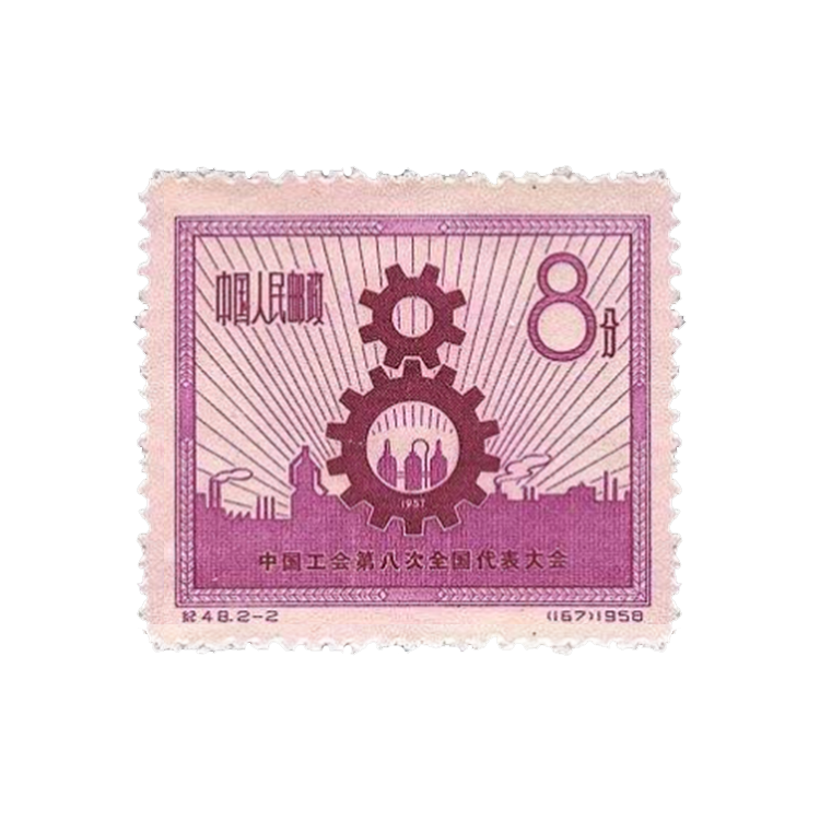 1958年5月25日,为祝贺中国工会第八次全国代表大会的召开,邮电部发行了 此纪念邮票,1套2枚。