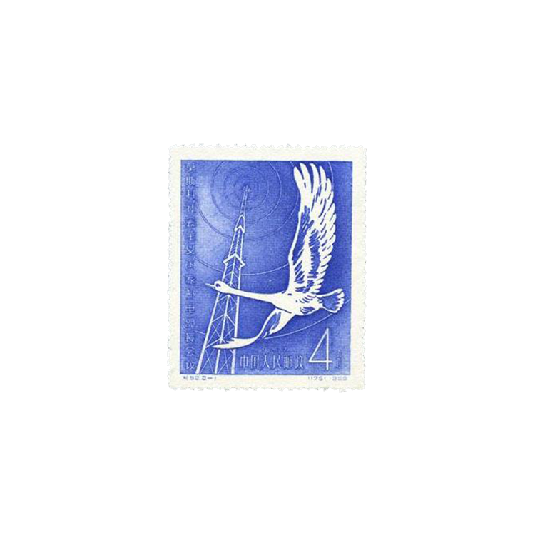 邮票图案是一座电信号发射塔和一只凌空展翅的大雁,分别表示电信和邮政事业。邮票上的电信号发射塔是近顶上部分,并画有无线电信号发射波,象征电信事业的发达。