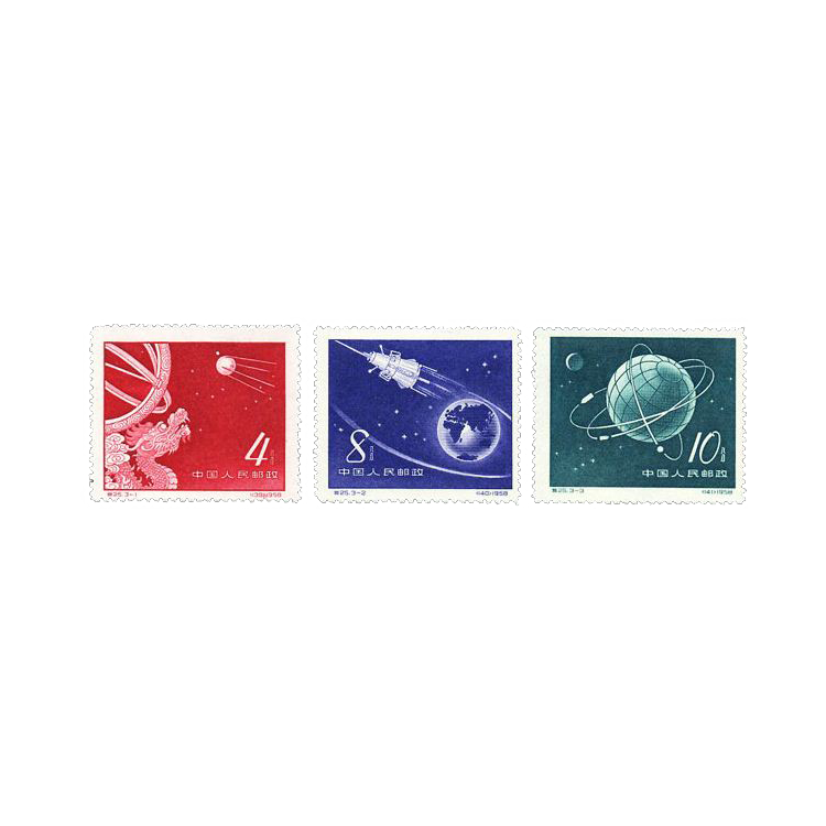 1958年10月30日,为纪念苏联人造卫星发行该套邮票,全套共3枚。