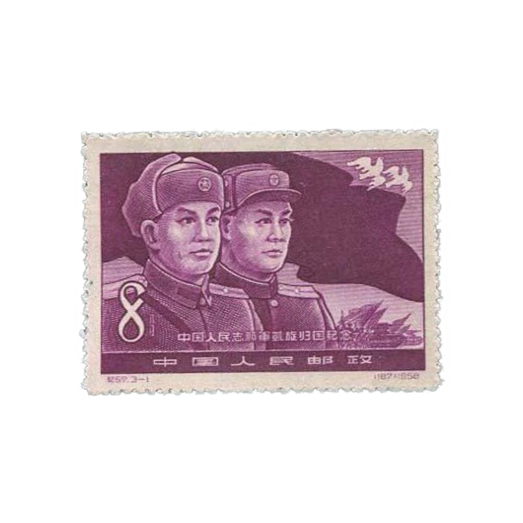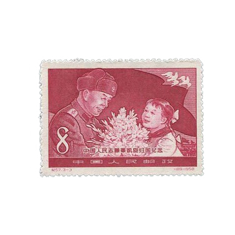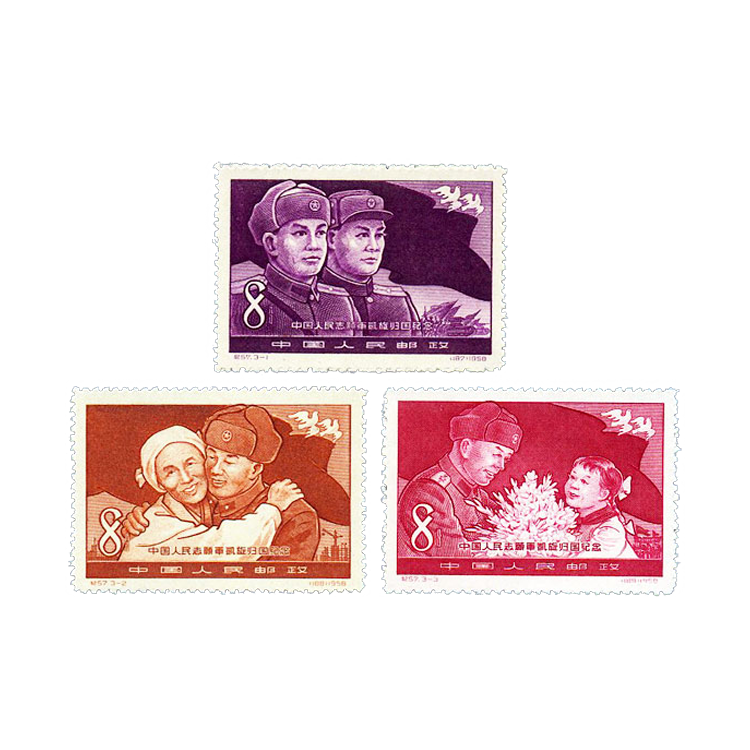 1958年11月20日,为欢迎中国人民志愿军凯旋归来,邮电部发行了此纪念邮票,1套3枚。