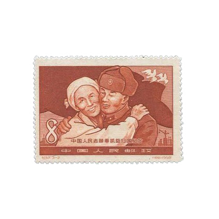 1958年10月20日,为欢迎中国人民志愿军官兵凯旋归来,展现了志愿军与朝鲜人民军、朝鲜人民在战争中以鲜血凝成的友谊,以及祖国人民对志愿军战士的思念之情。邮电部发行了《中国人民志愿军凯旋归国纪念》纪念邮票,全套3枚。