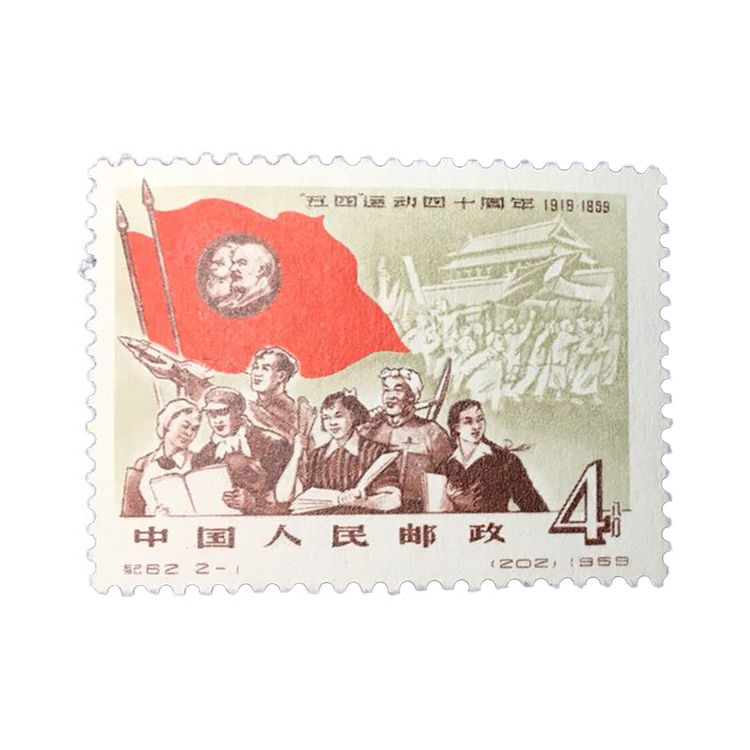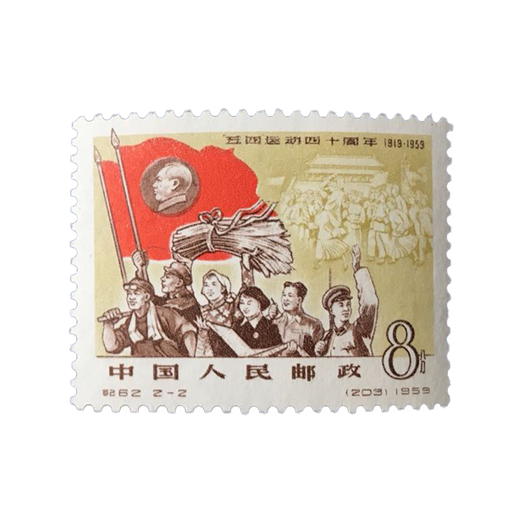 1959年7月1日,为纪念“五四”运动四十周年发行该套邮票,全套共2枚。值此伟大的“五四”运动40周年之际,国家邮电部发行了这套“五四”运动四十周年纪念邮票。主图分别为高举马列主义旗帜“向科学技术进军”的人们和高举毛泽东思想旗帜的“工、农、商、学、兵”各界群众背景为天安门及“五四”运动浮雕,表现在马列主义的旗帜下,工农商学兵发扬五四精神,继承五四传统,胜利前进的姿态。