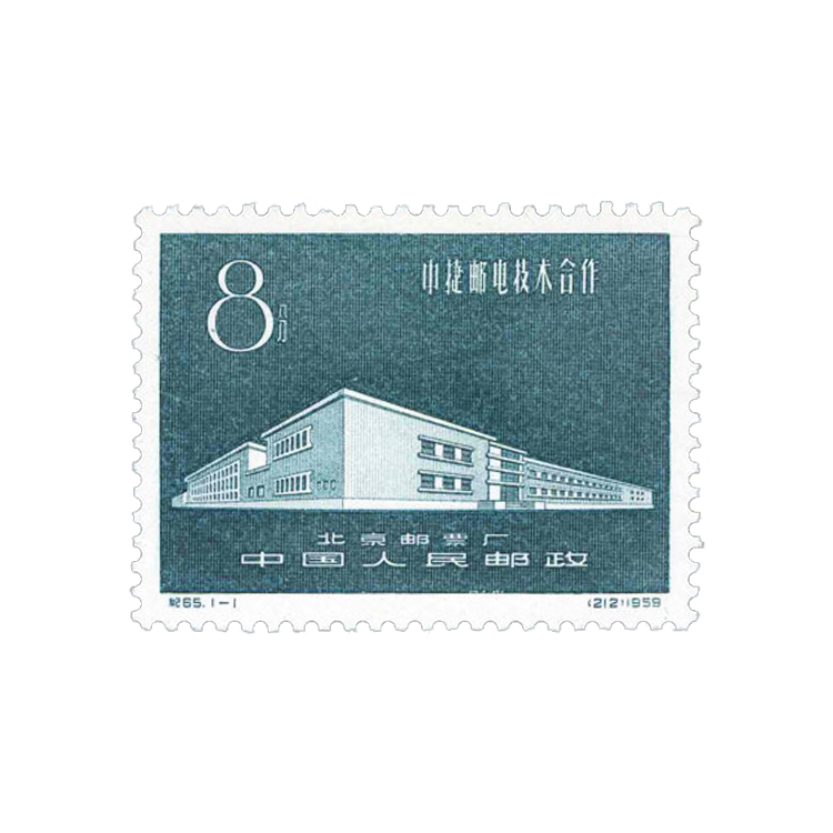 1959年8月15日,为庆祝中捷两国在北京邮票厂筹建工程中技术合作的成功,我国邮电部发行“中捷邮电技术合作”纪念邮票,编号纪65,全套1枚。图案采用北京邮票厂外景,画面采用深绿色衬底,既是中国邮政的专用颜色,具有标志性,也寓意中国邮政事业的繁荣发展。