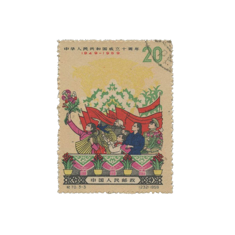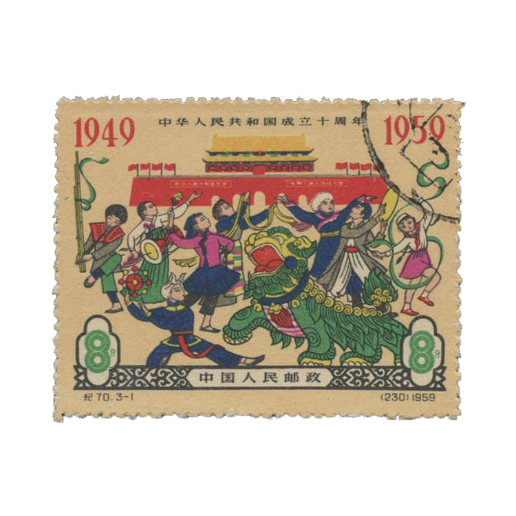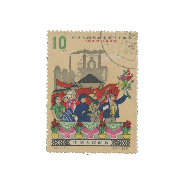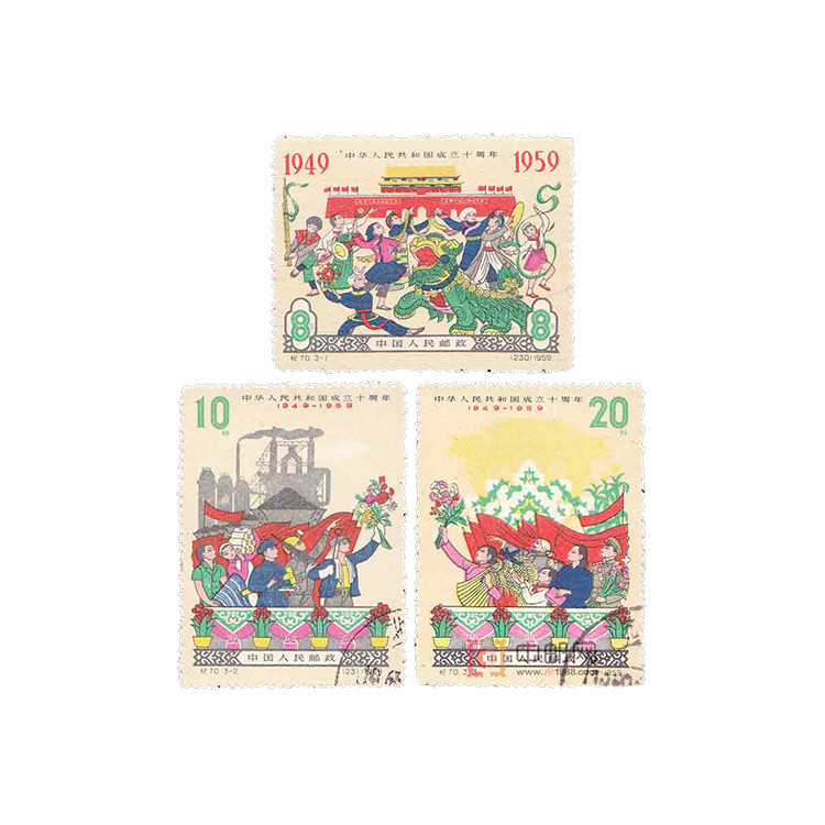 1959年10月1日发行,为庆祝建国十周年,邮电部发行了5组纪念邮票中的第四组,一套3枚。