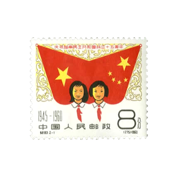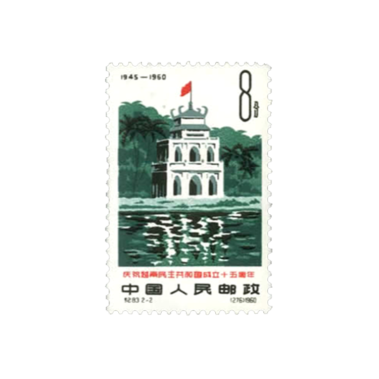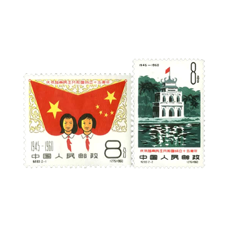 1960年9月2日邮电部为庆祝越南民主共和国成立15周年发行了这套纪念邮票,画面表现了中越两国的传统友谊和越南的风光及历史,全套2枚。