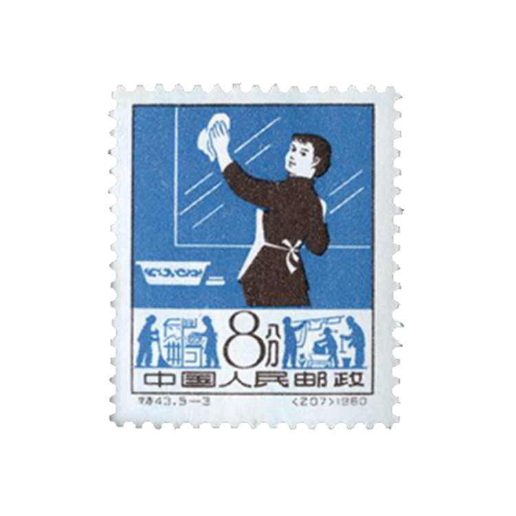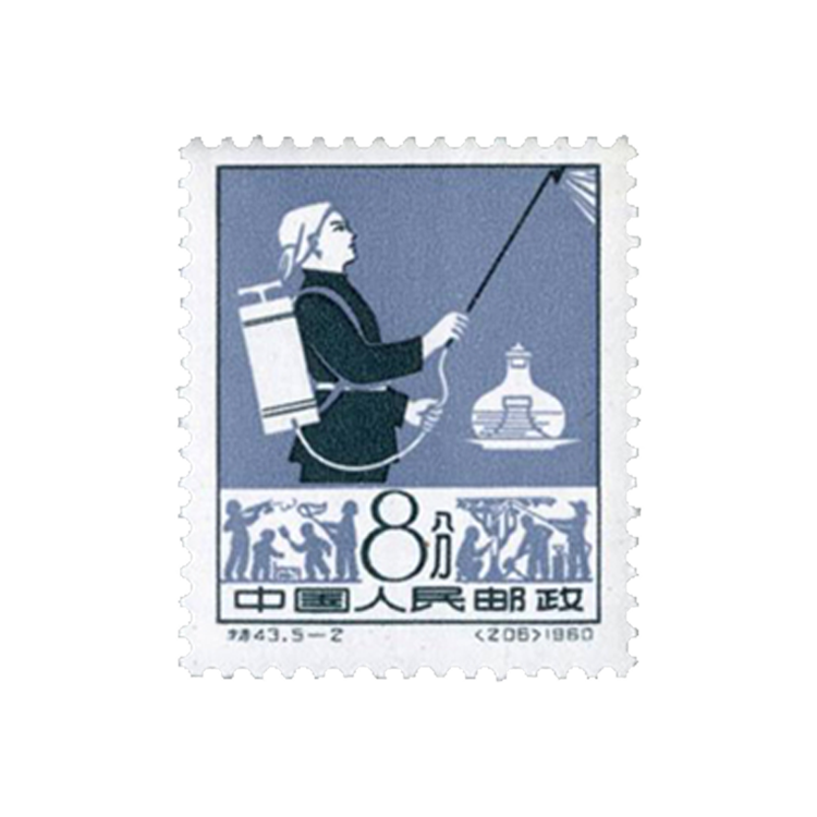 为了宣传这一爱国卫生运动,我国于1960年9月10日发行了“爱国卫生运动”特种邮票,编号T43,全套5枚。分别以改善工人劳动条件的“厂矿卫生”、喷药杀虫的“除四害”、搞好家庭清洁卫生的“讲卫生”、医生给儿童检查身体的“预防疾病”和老人在打拳的“锻炼身体”为图案,反映了当时爱国卫生运动的内容和特点。
