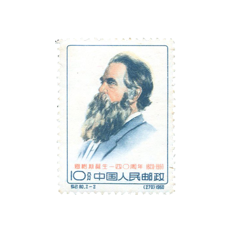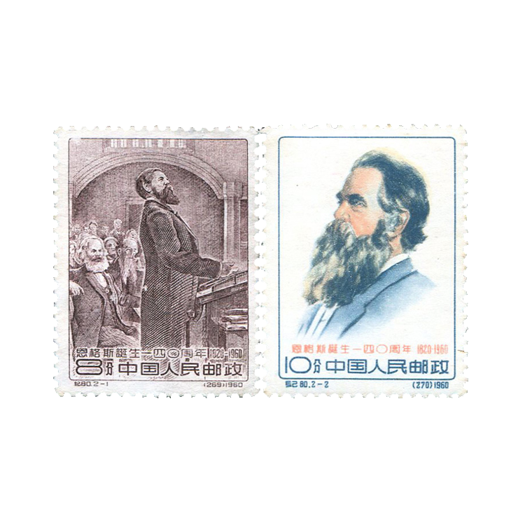 1960年11月28日邮电部为纪念伟大的无产阶级革命导师恩格斯诞生140周年(1920-1960)发行了这套纪念邮票,表达中国人民对他的崇敬和怀念,全套2枚。