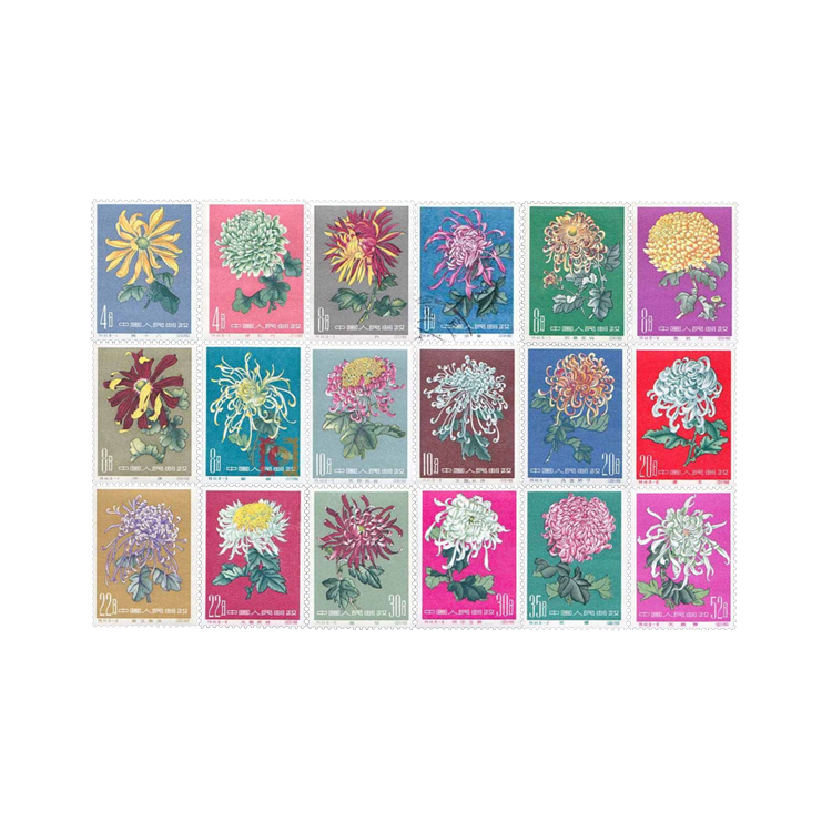 菊花是中国十大名花之一,1960年12月10日邮电部为了让更多人欣赏到她的姣资,特发行菊花邮票,全套18枚。