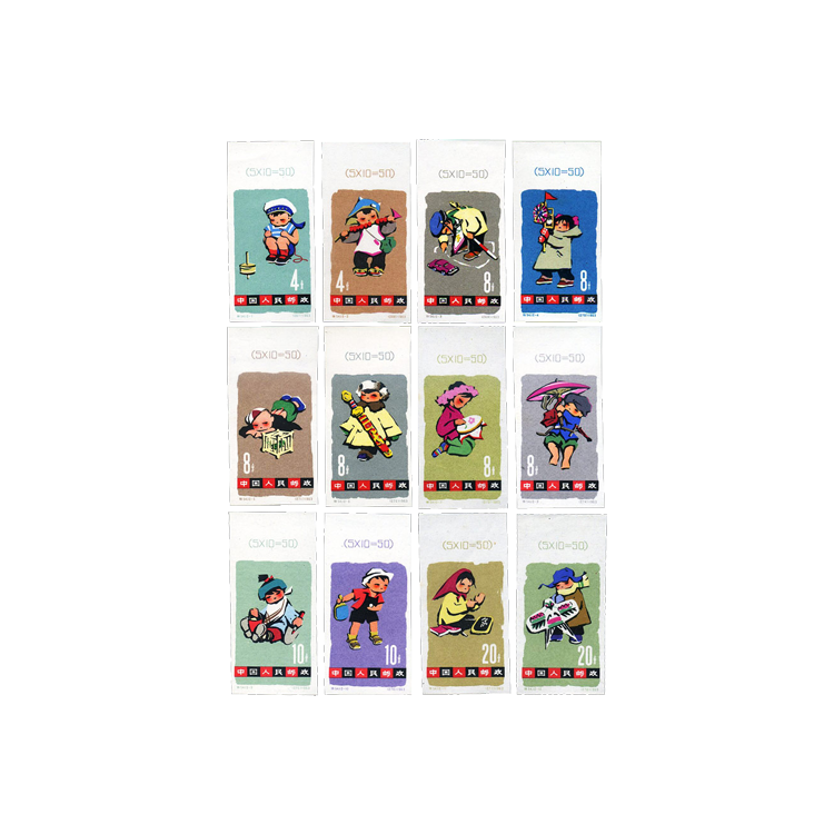 1963年6月1日儿童节邮电部为了集中反映解放后的50,60年代,新中国少年儿童在党的阳光雨露茁壮成长的面貌而发行的邮票,全套12枚。