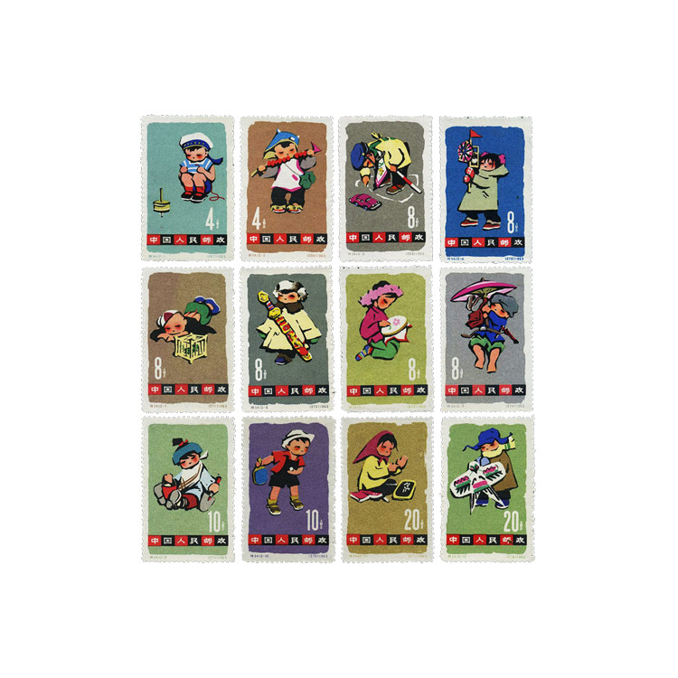 1963年6月1日儿童节邮电部为了集中反映解放后的50,60年代,新中国少年儿童在党的阳光雨露茁壮成长的面貌而发行的邮票,全套12枚。