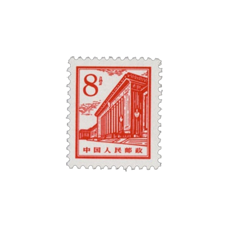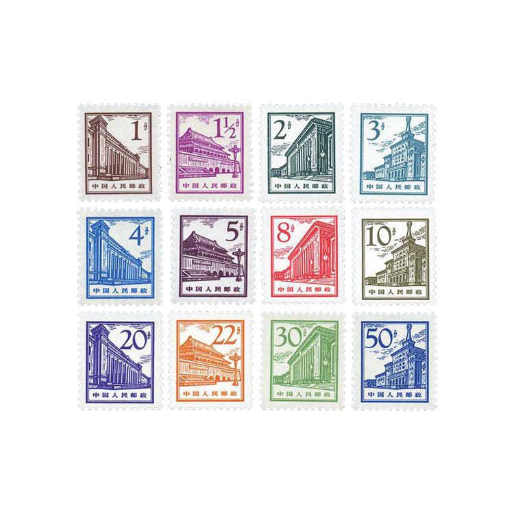 北京建筑图案普通邮票发行于1964年6月17日,属于胶板,齿数为p11.5×11,邮票规格为21×25毫米,整版邮票共有200枚,由万维生设计而成,在北京邮票厂印刷。这一组北京建筑邮票分别以天安门,人民大会堂军事博物馆,中国革命历史博物馆为图案。