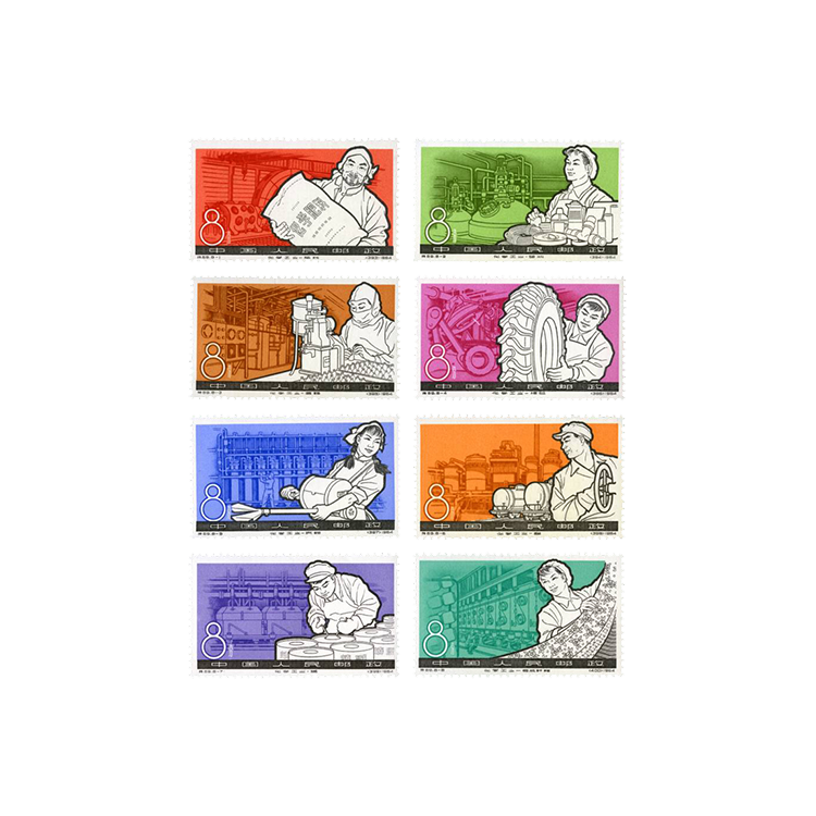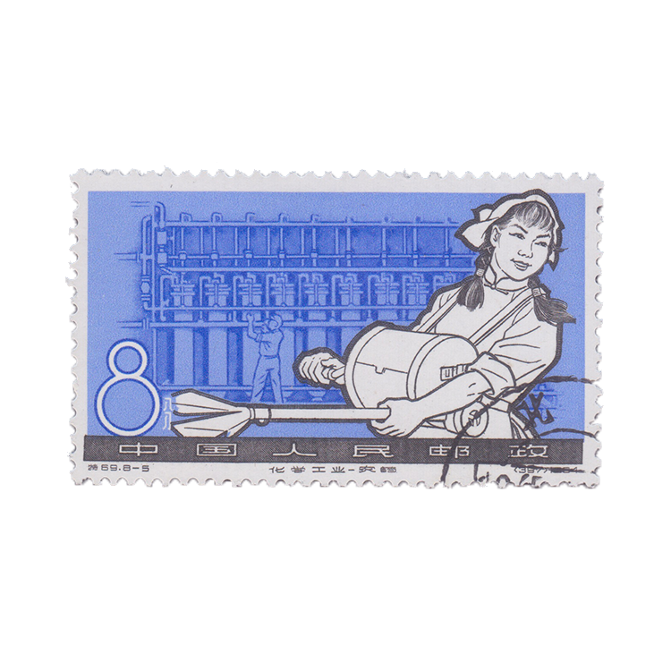 1964年12月30日,发行了一套“化学工业”特种邮票,共8枚,以反映中华人民共和国成立以来在化学工业取得的成就。本套邮票的图案设计采用了套色版画的形式,主图精雕细琢,黑白对比强烈。背景是与主图相关的化学工部门生产设备或厂房。