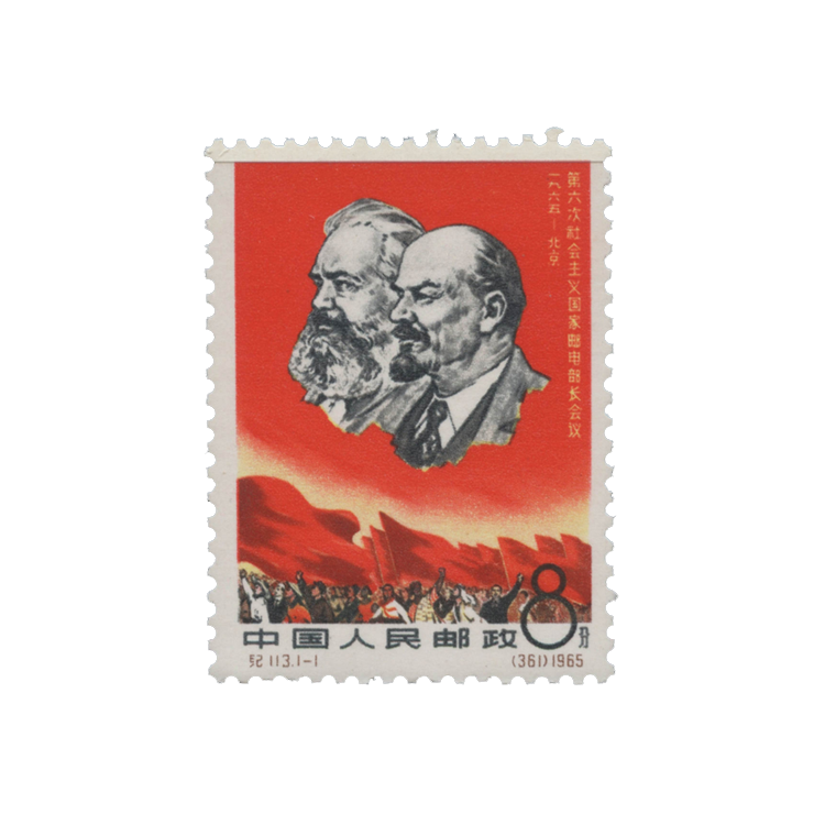 邮票为“在马克思、列宁主义旗帜下前进”。主图是马克思和列宁的头像。头像以木刻的艺术手法进行处理,线条刚健有力,使得人物轮廓分明,神态生动逼真。背景全部是红色的大块色调,它覆盖了整个邮票上面的大半部分,使人物形象更为突出。画面的下部是各国人民和无数面飘扬的红旗。整个画面表明了社会主义各国在马列主义的旗帜下,进一步维持和推广国际合作以改进电信的合理使用,促进各国邮电通信技术设备的发展及协调各国之行动,以使邮电更好地服务于社会主义建设事业,并为维护世界和平作出贡献。
