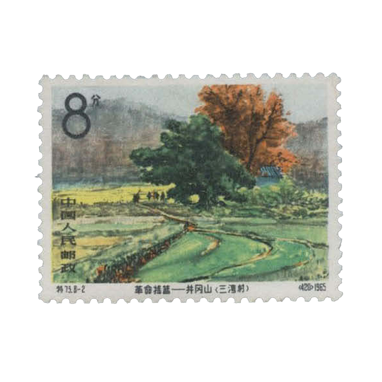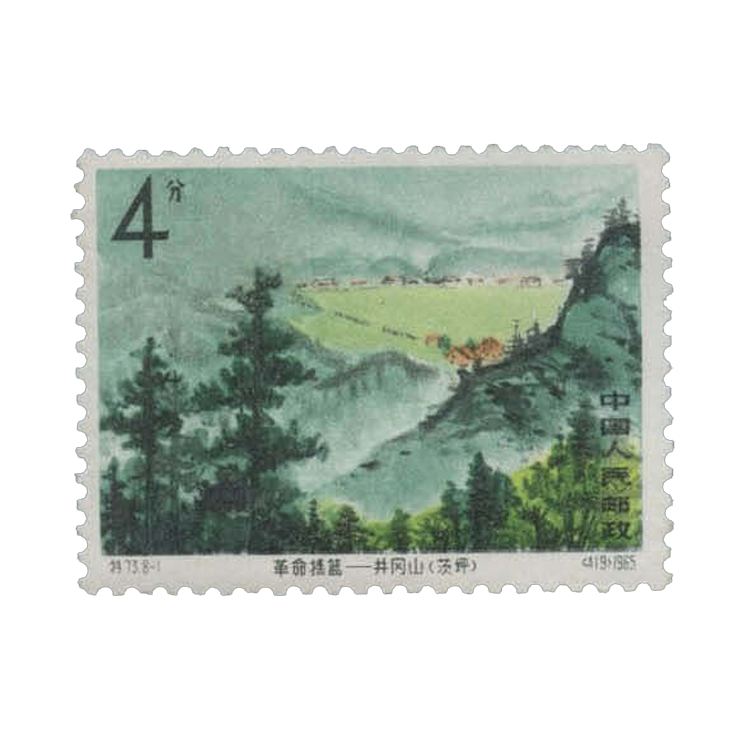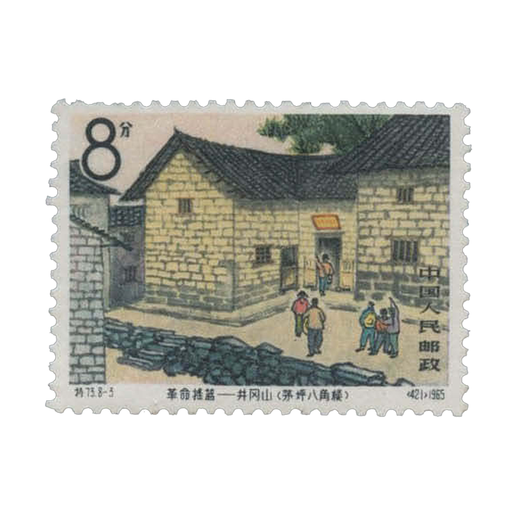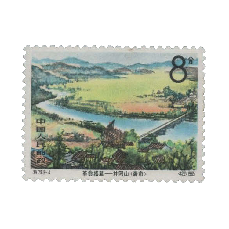 邮电部于1965年7月1日发行了这套特种邮票。图分别为茨坪、三湾村、茅坪八角楼、砻市、大井村、龙源口、黄洋界、井冈山主峰。
