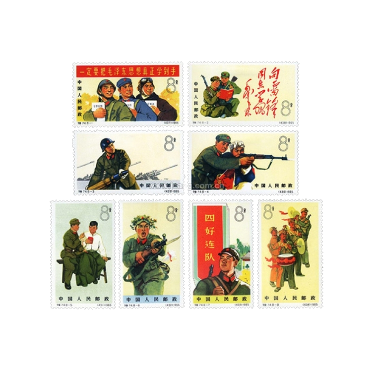 在中国人民解放军建军38周年之际,邮电部发行了这套特种邮票,8幅画面均采用了当年的宣传画进行设计