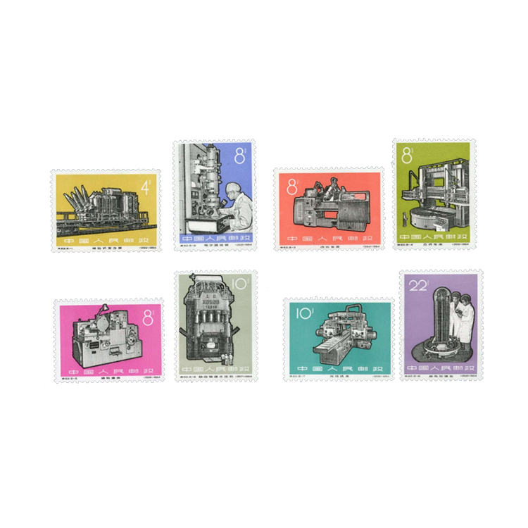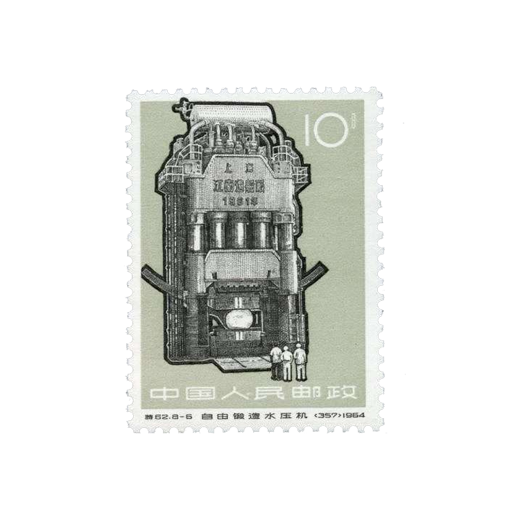 (357)为“自由锻造水压机”。图案是中国自行设计制造的第一台12000吨自由锻造水压机。这台万吨水压机有四根大立柱和上、中、下三个横梁,都是近百吨的大部件。该机能锻打二、三百吨重的特大钢锭,世界上只有很少几个国家能够生产。它的制造成功,标志着中国重型机器制造业跨入世界先进行列。