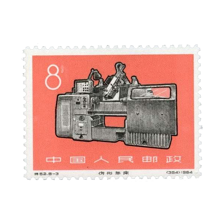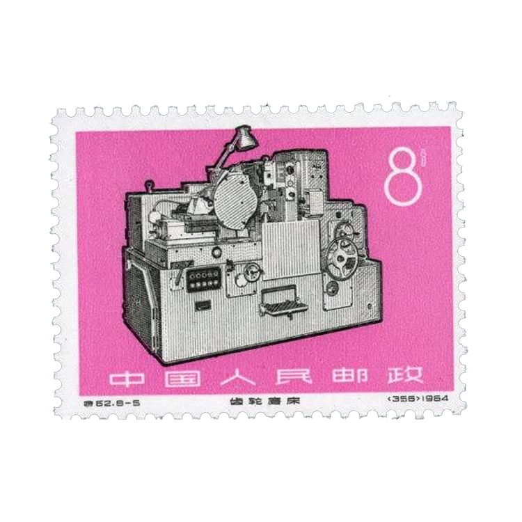 (356)为“齿轮磨床”。图案是小模数齿轮磨床,1963年由上海机床厂试制成功。该机床可以磨削直径10至150毫米、模数为0.1至1.5毫米的正齿轮。加工精度齿距误差小于3微米(1微米等于1‰ 毫米)。它生产效率高,某些功能已超过国外同类产品。