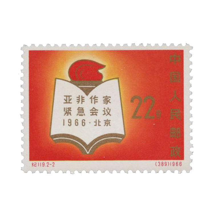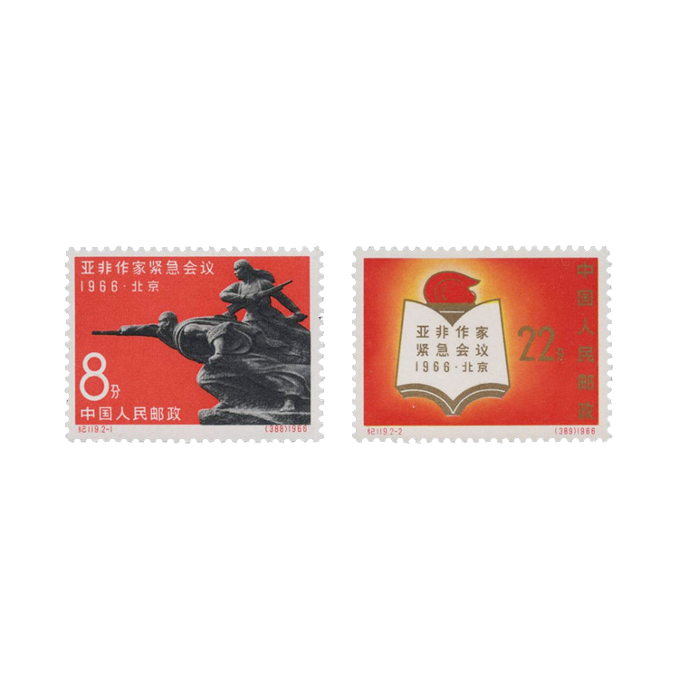 中国邮电部于1966年6月27日发行“亚非作家紧急会议”邮票,一套2枚。该邮票由邵柏林设计,北京邮票厂印制