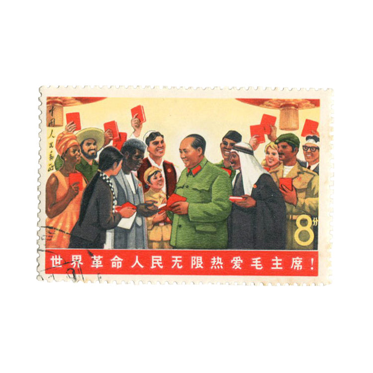 1967年10月1日的国庆节为了凸显出毛泽东主席,特意发行了全套两枚的《毛主席与世界人民》“文”字头邮票。于是军管会就建议将《毛主席是世界革命人民心中的红太阳》这个宣传画作为邮票题材,这样就可以颂扬毛主席为了世界革命所作出的伟大努力。这两套邮票就是毛主席是世界革命人民心中的红太阳与毛主席和外国朋友。