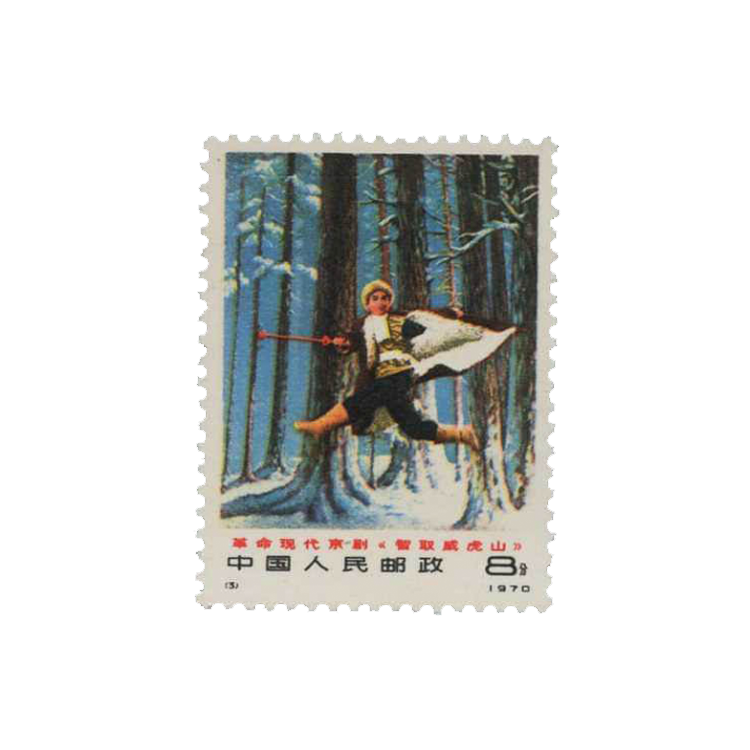 打虎上山,画面依据该剧第五场“打虎上山”的一幅剧照进行设计。侦察英雄杨子荣告别战友,肩负着党和部队的重托,登上威虎山,只身进入三代恶匪国民党旅长座山雕的营寨,以惊人的勇敢和超人的智慧,战胜了老奸巨滑的座山雕,蒙骗了穷凶极恶的八大金刚,终于调动了敌人,歼灭了这批顽匪。在审讯座山雕时,这个老狐狸哀叹道:“没想到我崔某闯荡60年,倒落在你们八路军的一个排长手里。”邮票画面上,杨子荣迎风踏雪,策马急驰,“为剿匪先把土匪扮,似尖刀插进威虎山”,表现了气冲霄汉的英雄气概。