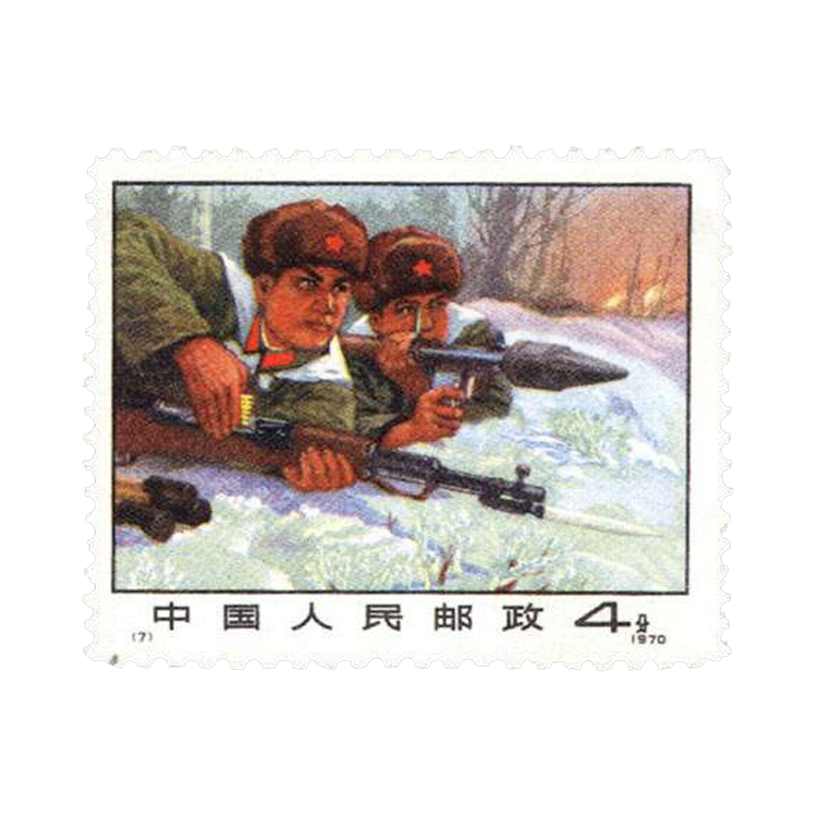 1970年11月1日,为了宣传中国人民解放军在中苏边界进行自卫反击战的胜利,中华人民共和国交通部发行一套《严惩入侵之敌》编号邮票,全套1枚。