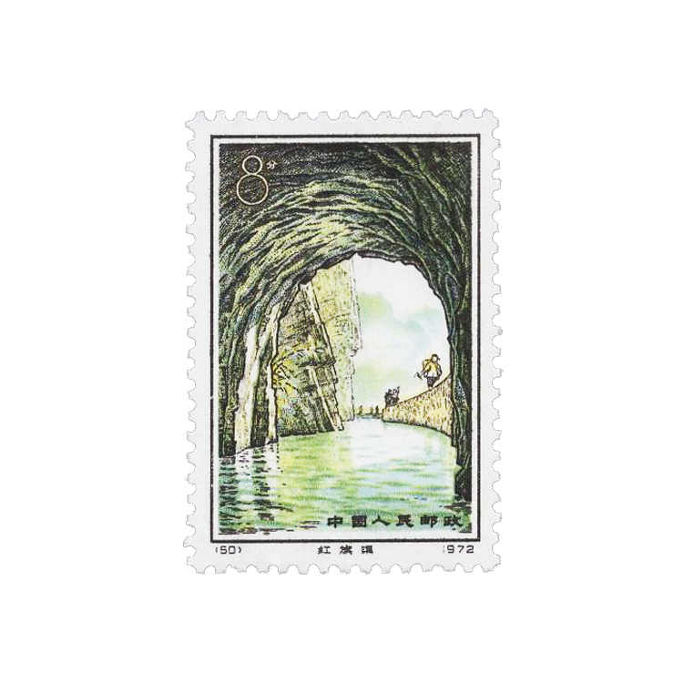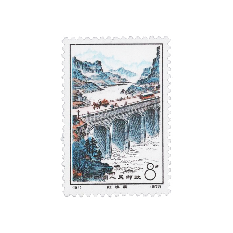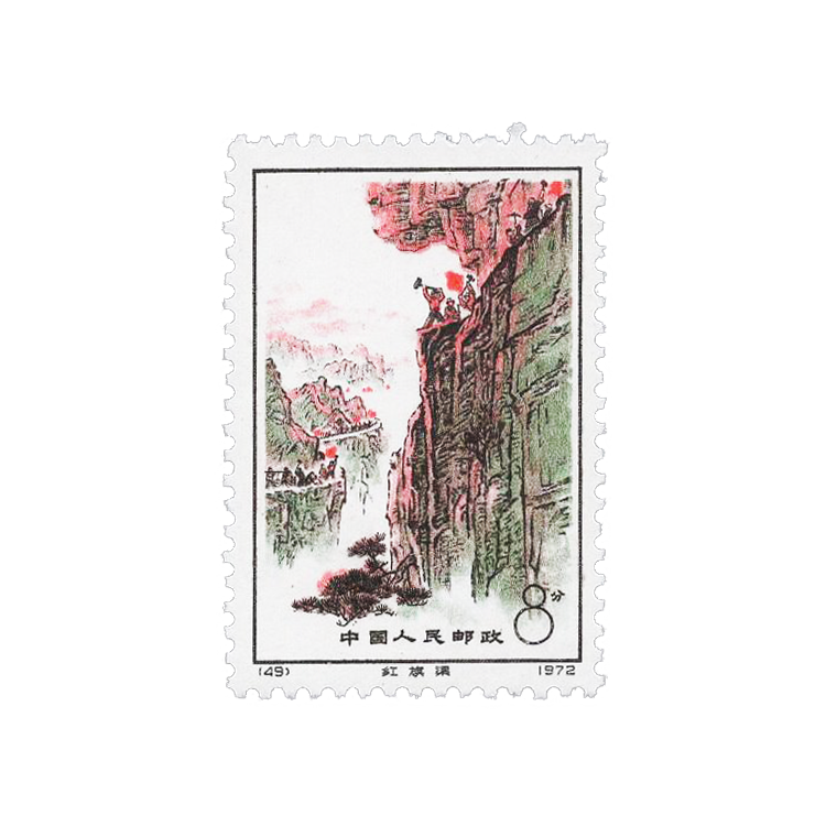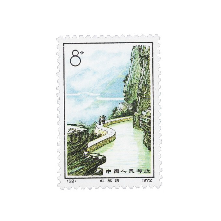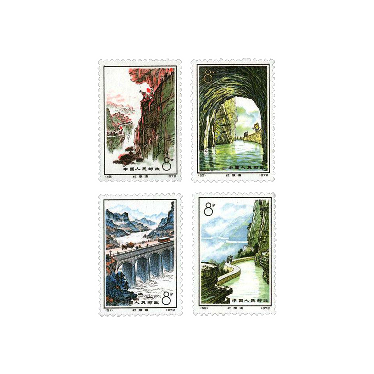 红旗渠是河南省林县为解决本县缺水困难动员全县人民,使用简陋的工具,克服重重困难,经过近10年的艰苦奋斗修筑而成的引水工程。二十世纪六十年代,林县人民在极其艰难的条件下,从太行山腰修建的引漳入林工程——红旗渠,被世人称之为“人工天河”,在国际上被誉为“世界第八大奇迹”。为纪念这一引水工程,国家邮政总局发行了这套邮票全套4枚。第1枚为“愚公移山”,体现林县人民艰苦奋斗、克服重重困难的精神。后3枚邮票图案反映了红旗渠工程的主要部分,红旗渠上的桃源桥,是一座七孔石拱桥,桥面下设渠道,交通与过水两用。