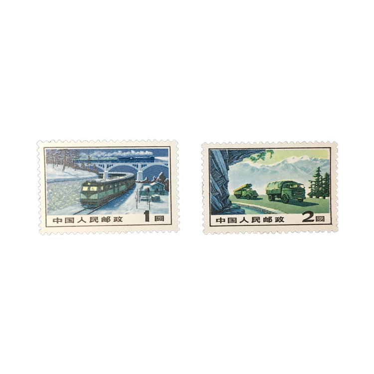 随着我国该逐渐改善交通运输网,技术装备也在不断升级,运输效率在建国不久就有了明显的提升。随着公路建设和石油业的发展,公路运输的地位渐渐也追上了铁路运输,负担的客货运量也在一直提升。两者都是构成我国交通运输的重要支柱。而这套邮票一共两枚,一枚就是铁路运输,展现了一辆正在形式的旅客列车。而另一枚则是公路运输,展示了一辆正在雪山公路上行驶的汽车。