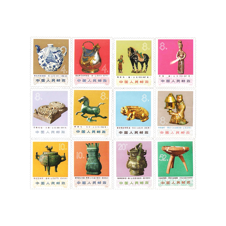 “文化大革命”后期,一批珍贵文物出土,在文物界产生了重大影响。本套邮票共12枚,展示的是一批“文化大革命”期间出土的文物精品,共12件。