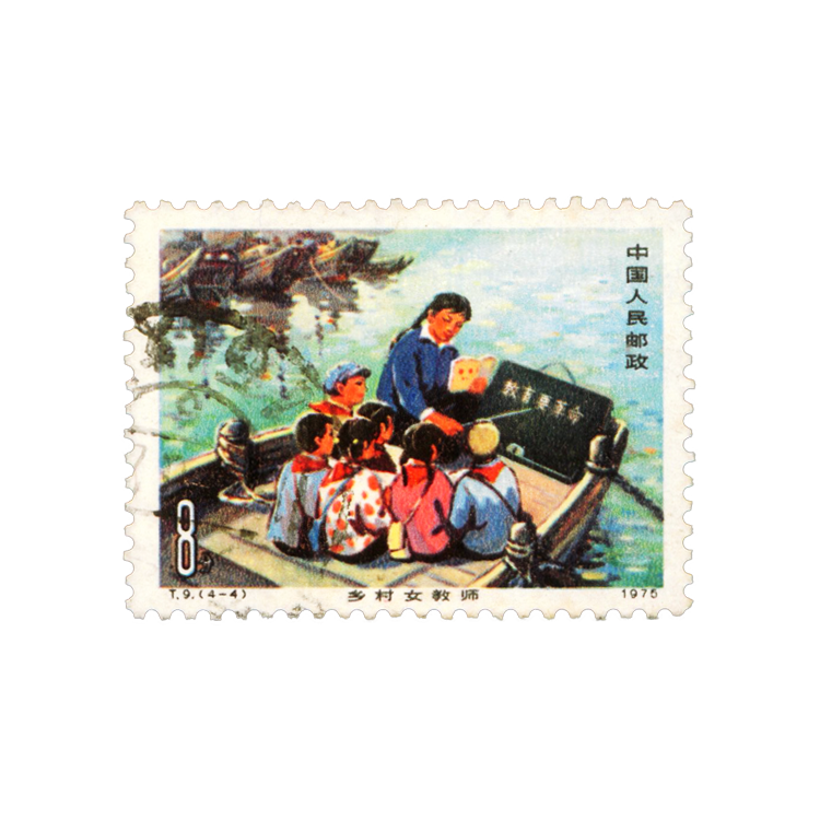 第四枚,展现在我们面前的是一幅典型的迷人的乡村风景画:碧波荡漾的小河以及停泊的一-排排渔船,洋溢着浓厚的生活气息,一名女教师在渔船上进行教学,别具一格,同时,也显示着乡村女教师的艰辛和任重道远。