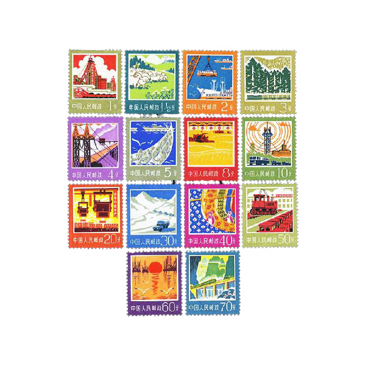 这套邮票的14种图案,中心画面统一镶嵌在不同的单色边框之中,既形成多色套框,又仿佛是一个个小小的窗口,生动地展示出了中国工农业生产建设的风貌。构思精巧,朴实鲜明。