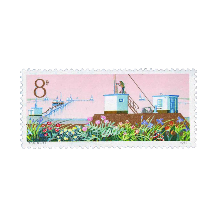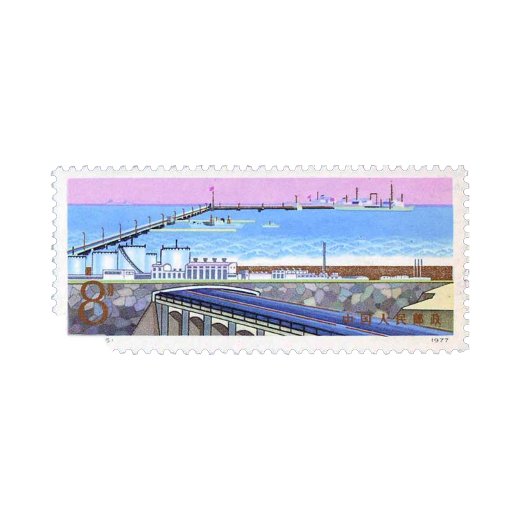 (6-5)输油。输油同样是石油工业很重要的组成部分。此枚邮票的图案为巨大的油港码头,长长的输油管道通向近海泊位上的万吨油轮,表现了输油的情景。