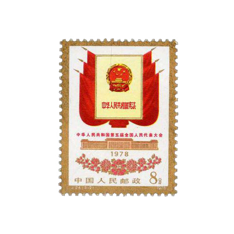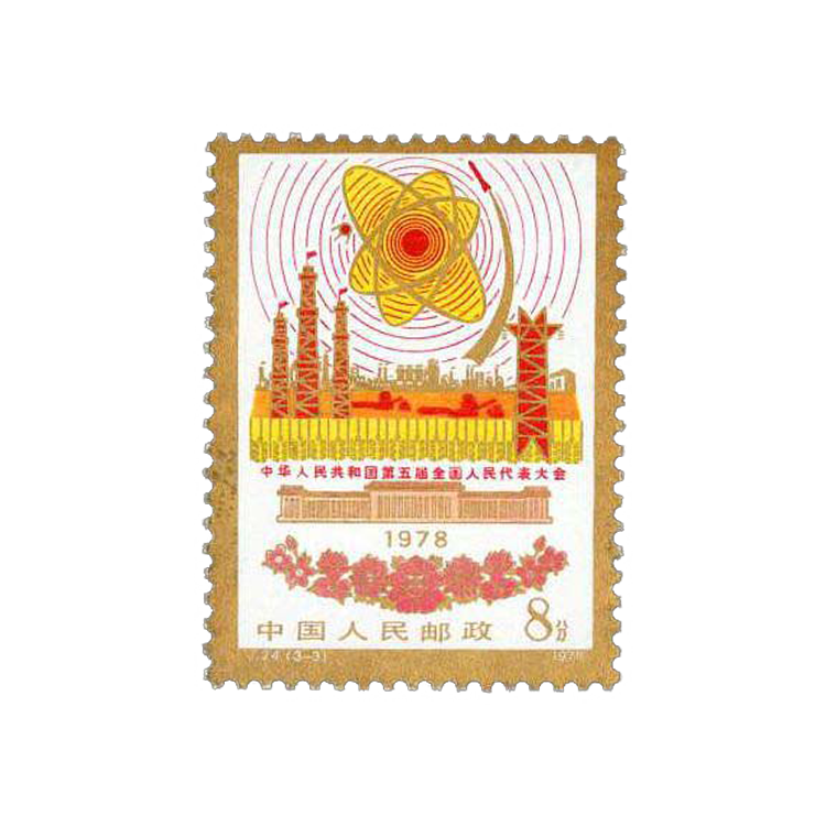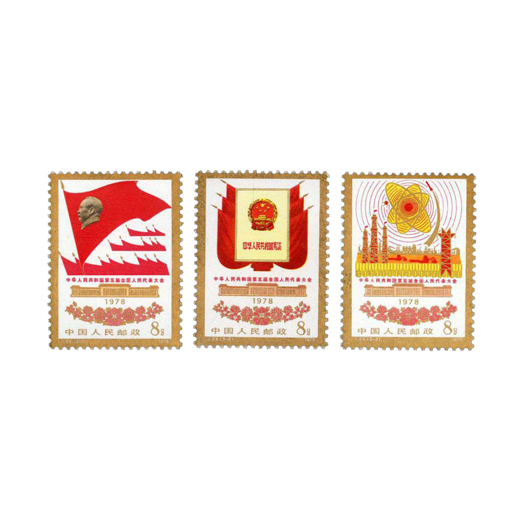 为了庆祝五届人大胜利召开1978年2月26日,中华人民共和国邮电部发行一套“中华人民共和国第五届全国人民代表大会”纪念邮票,编号J24,全套3枚。这套3枚邮票下方,均有人民大会堂的图形及“1978”字样,说明会议召开的地点和时间,并有盛开的牡丹花作衬托,寓意着人民的幸福和富贵吉祥。