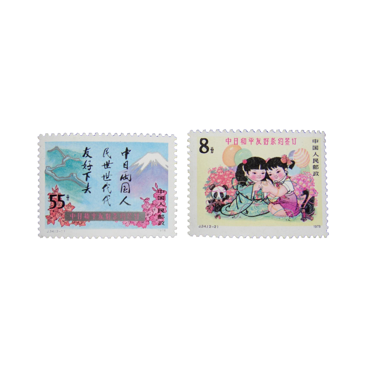 2-1为“共同愿望”。图案正中是中国文化名人和社会活动家郭沫若先生的亲笔题字:“中日两国人民世世代代友好下去”。书法遒劲有力、端庄大方。郭沫若先生不但在中国备受推崇,而且也为许多日本友人所熟知和尊敬。他的书法艺术博采众长,被两国人民共同视为珍品。邮票的背景是蜿蜒迤逦、雄伟壮丽的万里长城和白雪覆顶的日本名山——富士山,左右对称,顾盼有姿,象征着中日两国的友好关系源远流长,世代相传。邮票底部的左边是一树热烈似火的红梅,右侧是一株娇艳夺目的樱花,中间托起邮票的主题文字:“中日和平友好条约签订”。整幅邮票端庄对称,色彩明丽,具有极强的装饰效果。