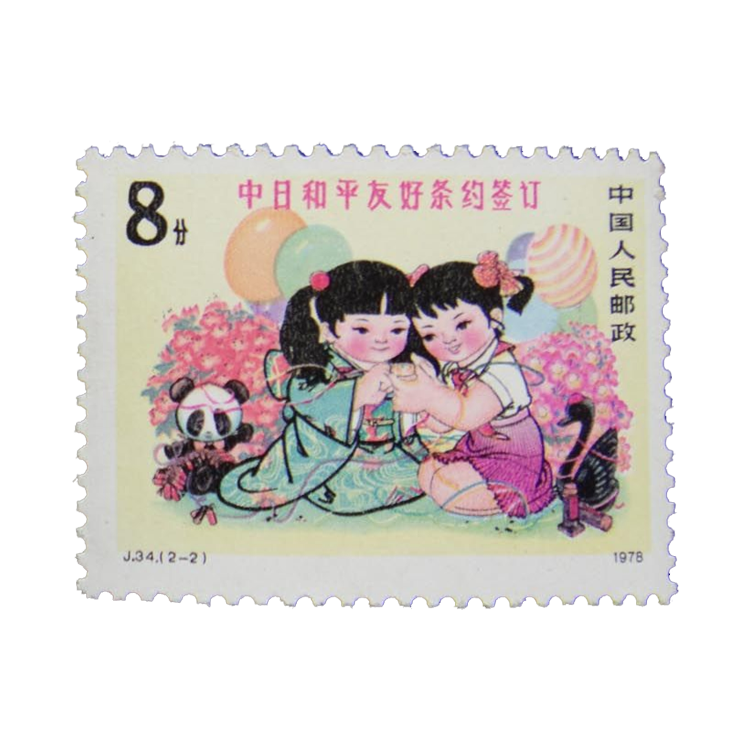 2-2为“中日人民世代友好”。邮票的中心图案是一对中日小女孩在一起玩耍。图案借鉴了中国民间年画的某些特色,把这对小女孩刻画得粉嫩娇艳,稚态可掬,逗人喜爱。两个小姑娘身边各有一可爱的动物小玩具。左边是中国的大熊猫,这是日本女孩得到的礼品;右边是日本的黑天鹅,是中国女孩得到的礼品。两人以礼物传递友谊,亲切动人。人物背后簇拥着多彩多姿的鲜花和气球,背景底色为淡黄色。作者通过这些处理把中日和平友好的喜庆吉祥的气氛描绘得十分得体。主题文置于邮票的顶端,恰与第一枚邮票形成对照,显得十分和谐。